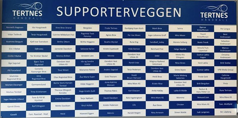 Supporterveggen ble lansert høsten 2020, som et støtteprosjekt til Tertnesjentene i en utfordrende tid. Siden den gang er veggen blitt fornyet foran hver sesong, og i år blir intet unntak. Også vi i Tertnes merker at det er tøffere tider, og selv om vi har økt antall samarbeidspartnere, er økte kostnader, ikke minst på reise, merkbart for klubben. Dermed er støtten også fra privatpersoner viktig for oss, og for kr 300 kan du få ditt navn (og/eller navnet til noen i familien eller andre du kjenner) på eget felt på SUPPORTERVEGGEN.