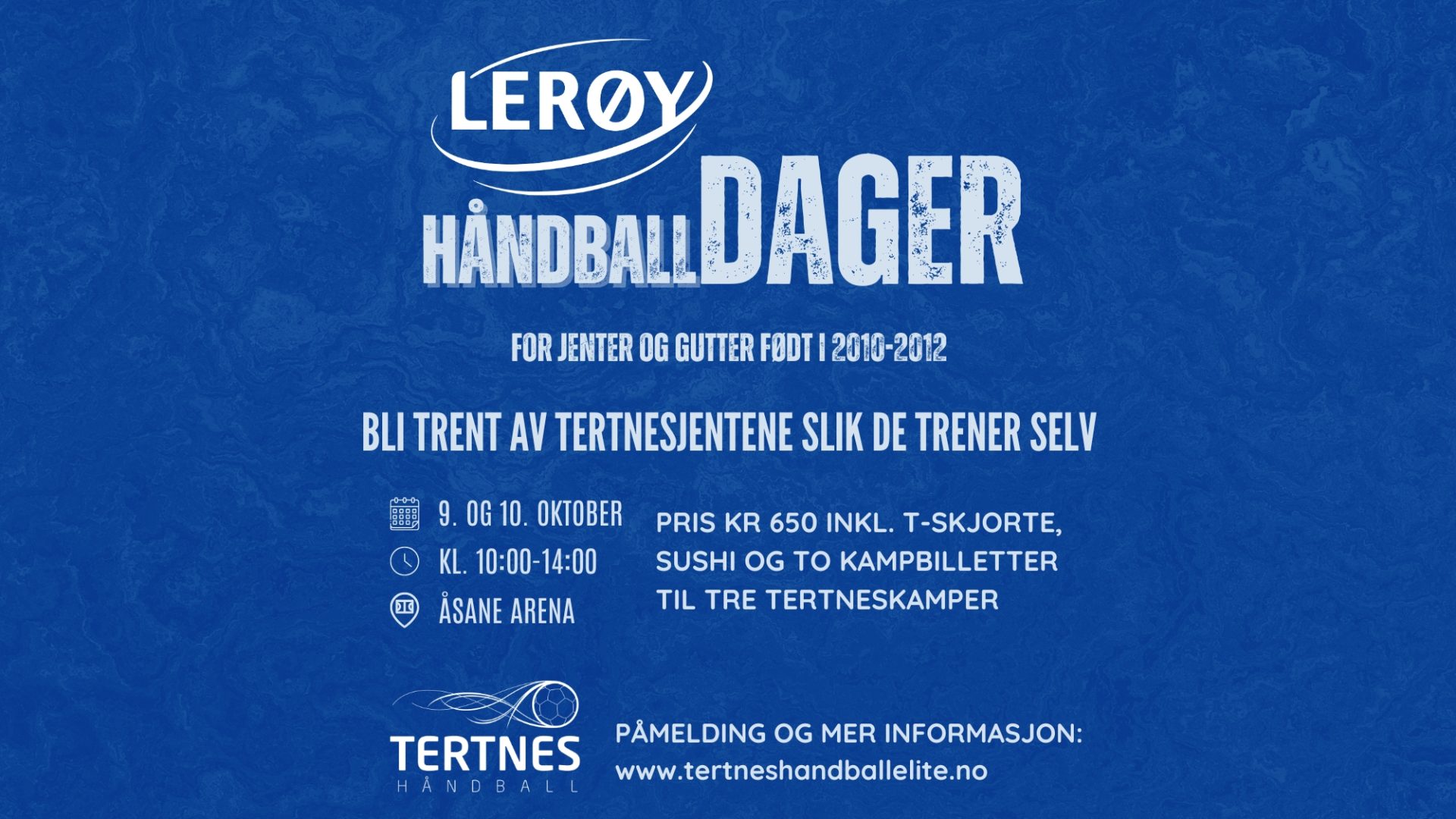 Lerøy Håndballdager gjennomføres i Åsane Arena torsdag 9. og fredag 10. oktober. Det er Tertnesjentene som er instruktører, og øvelsene vi gjennomfører er blant øvelsene som Tertnesjentene selv trener på, tilpasset deltakernes nivå, og utarbeidet av Tertnes-trener Tore Johannessen.