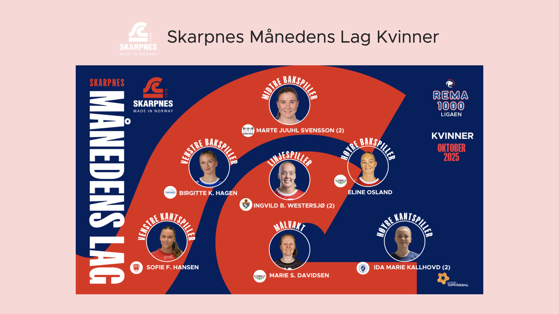 Skarpnes Månedens Lag for kvinner er satt sammen basert på statistikk. For å være aktuell må spillerne ha deltatt i minst tre kamper i løpet av måneden, og konkurransen om plassene har vært tøff.